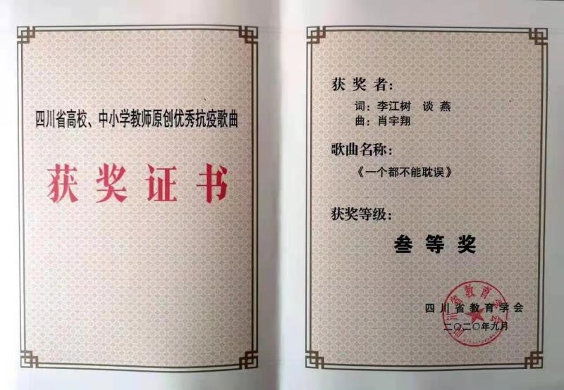 近日,由九三学社泸州市泸县基层委社员、泸州市音协创委会秘书长李江树创作的抗击疫情原创歌曲《一个都不能耽误》获得四川省高校、中小学教师原创优秀抗疫歌曲三等奖,并由四川省教育学会编辑出版歌曲集。