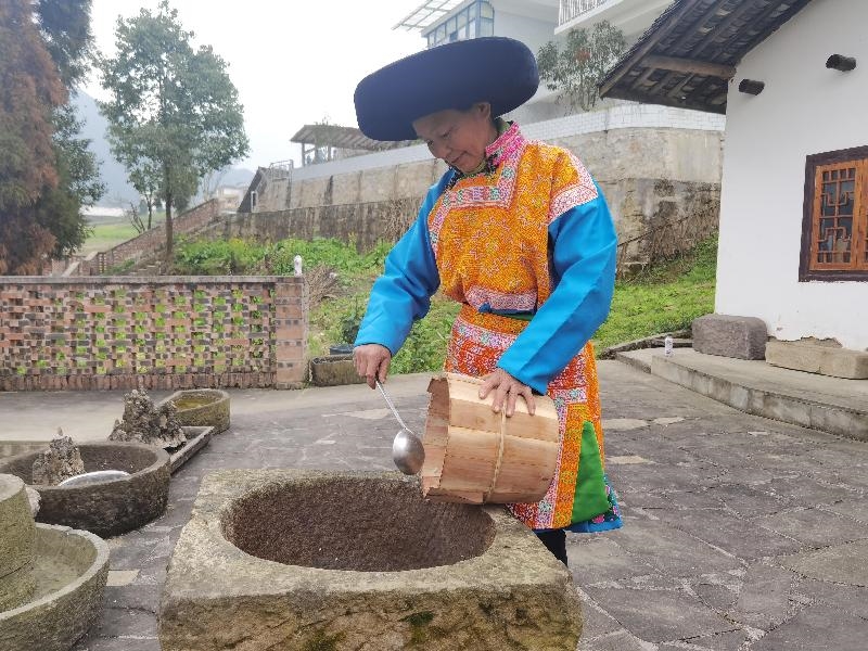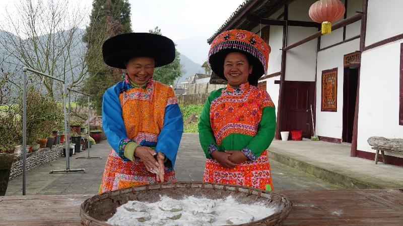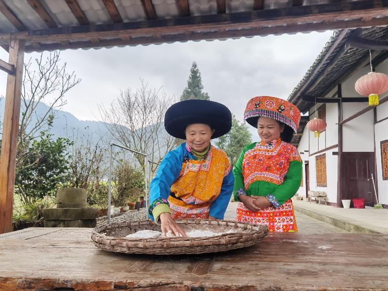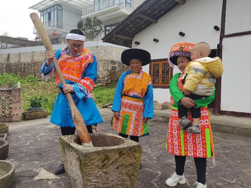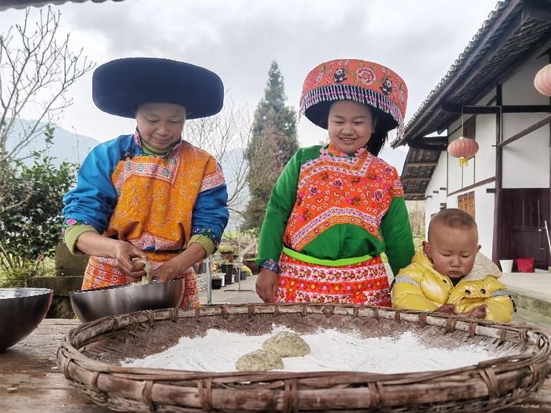 小院里,力气大的年轻人杨刚挥动着十来斤重的舂捶反复舂打,杨太珍阿妈则用竹刷不断将冷水刷到米团上降温除粘,熊春花抱着小儿子在一旁认真学习制作,其乐融融。