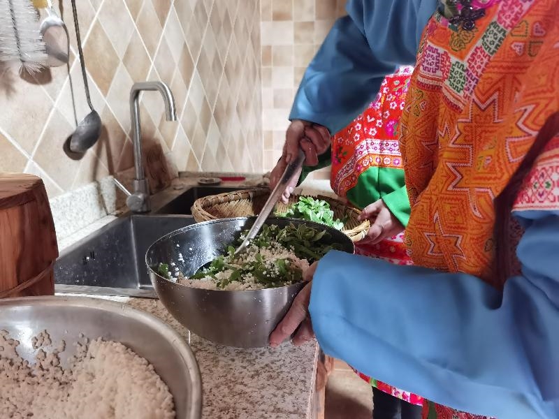 制作美食需遵循食材本身属性。与现摘的软萩草不同,它的搭档糯米得提前泡发,再与软萩草充分搅拌混合后放入蒸笼大火蒸制。蒸笼旁,当问及软萩草和糯米的混合比例时,杨太珍阿妈笑着说:“各家有各家的味道,我制作的手艺都是从父母那里学的,根据个人喜好,爱吃软萩草的可以多放点。”