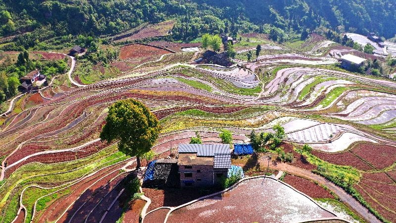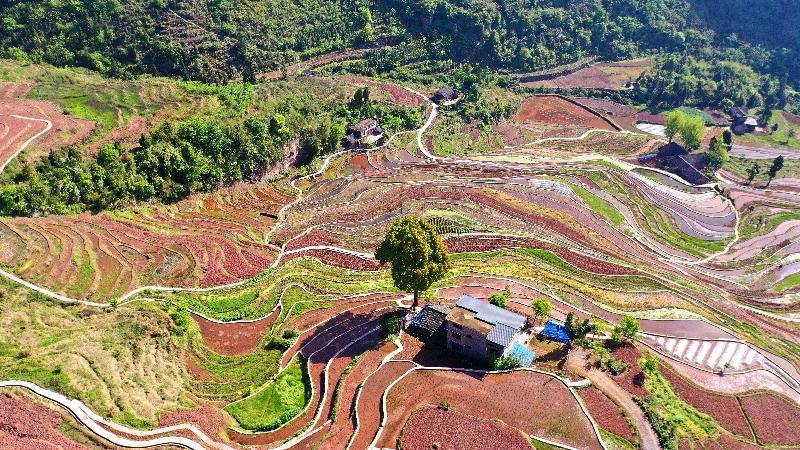良田纵横阡陌,春耕一派繁忙。在泸州市古蔺县德耀镇凤凰村,梯田星罗棋布,一片连着一片,蜿蜒层叠,形状各异,在春日大地上焕发着勃勃生机。
