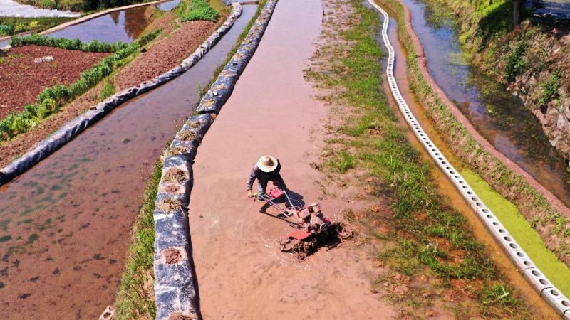 清明过后,犁耙水响,正是水稻备耕育秧的黄金时节。梯田里水满泥润,村民们正抢抓农时,犁田耙地、培育秧苗,为插秧做准备。“我家种了近十二亩地,全是稻鱼共生,鱼沟和田坎已经全修完了,现在是在打田,再隔个把月,就可以插秧了。”乡贤人士祝仁富说。