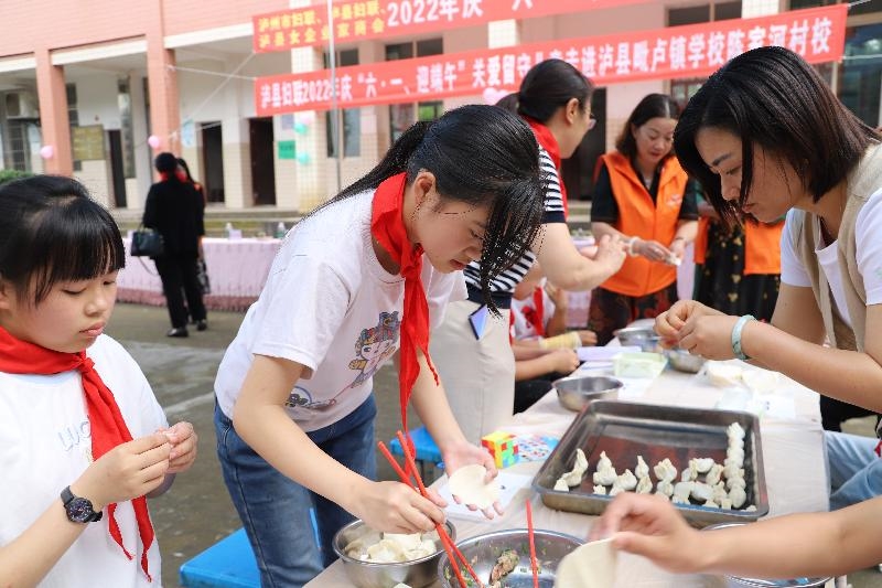 活动在嘹亮的国歌声中拉开帷幕。泸州市妇联调研员黄智玉、泸县妇联主席熊开芬、泸县女企业家商会会长郑玉梅、毗卢镇党委书记季绪宁纷纷向孩子们送上节日祝福,祝愿孩子们好好学习,健康成长,并送上慰问礼品。泸县毗卢镇陈家河村校组织开展了诗朗诵、端午节知识问答、合唱等文艺活动和包饺子活动,向党委政府以及爱心人士们表达感谢之情,现场其乐融融,充满欢声笑语。