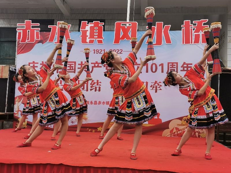 活动现场,三分村在家党员、少数民族群众、小学生等组成表演团队,通过表演红歌合唱、苗族芦笙舞等节目庆祝党的生日。