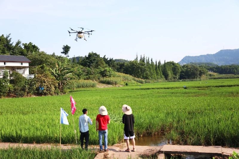 哦,原来是一台携带农药的无人机低空掠过绿油油的田野,农药均匀地喷洒在秧苗上。7月10日,西南无人机科技有限公司的飞手正在为江阳区梁山上家庭农场的水稻进行无人机植保服务,像这样的无人机植保每年要进行两次,这只是江阳区为新乡贤新农人雷益富提供的扶持政策中的一项。