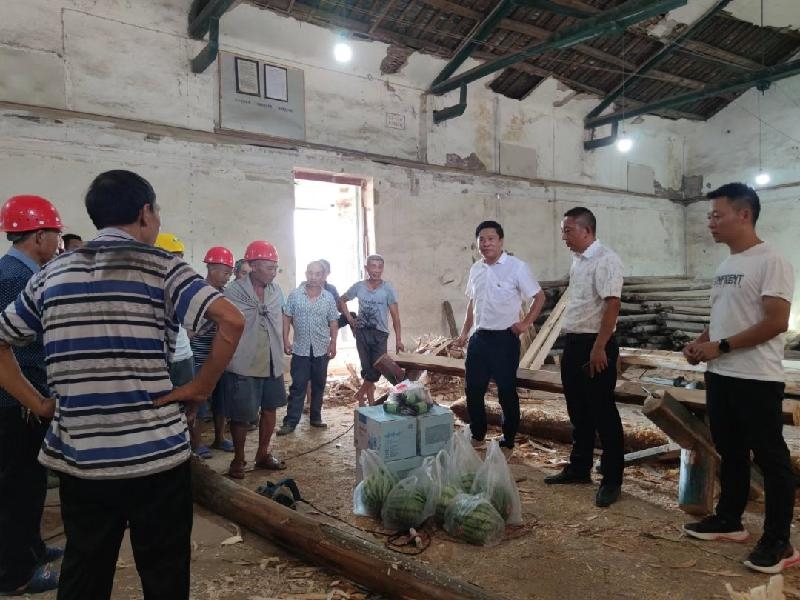 在先市酿造传承基地项目施工现场,工人们正埋头忙着作业。“来,来,来,大家辛苦了,来休息哈喝点水!”镇便民服务中心主任赵祥波一边往厂房搬运慰问物资,一边招呼工人们休息,“我今天代表镇党委、政府给大家送来一些防暑物品,这段时间天气很热,大家要注意防暑,注意劳逸结合,保持身体健康。”先市酿造传承基地项目负责人赵其兵一边接过物品一边说:“赵主任,这么热的天你还来给我们送东西来,党委、政府真是想得周到,实在太感谢了!”