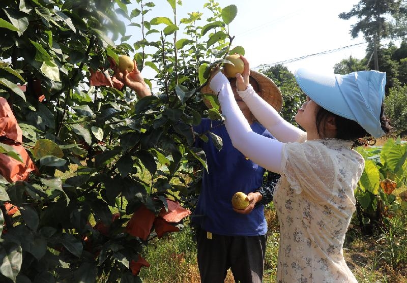 “大冲头村的翠冠梨果皮细薄、肉脆汁多,我们都很喜欢!”果园里,前来采摘的游客开始多起来,大家顶着40多度的高温从城里驱车到此,为的就是在炎炎夏日能吃上几个香甜爽口的翠冠梨。