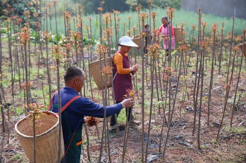 “红香椿含有丰富的蛋白质、脂肪、维生素和多种矿物质。第二茬椿芽价格都高,现供不应求。红香椿可是俺桂花村的‘宝贝’,村里人都视它为‘小金芽’。趁着价格好,大家麻利点,多采摘点!好卖个好价!”基地现场管理负责人段礼刚一边忙着打点椿芽上货车,一边喜滋滋说,“清晨6点钟就组织村民到基地采摘椿芽,每天可采摘300多公斤,当天上午就运输到重庆,然后空运到北京、上海、广东等地,甚至还远销俄罗斯等地。”