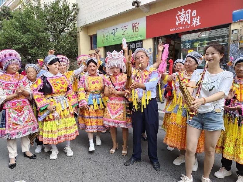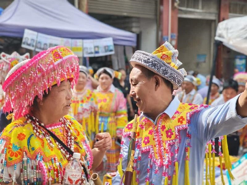 苗族同胞们早早穿上节日盛装,背上芦笙,载歌载舞,开始了一场独具苗家特色的游行。笙管朝天,奏出高亢悠扬的旋律,苗族同胞们随着节奏轻盈起舞,衣裙翻飞间,银饰发出清脆悦耳的声响。围观人群情不自禁地随着节拍鼓起掌来,旁边还有位汉族姑娘满怀热情地向他们请教芦笙的吹奏方法,并亲自上手体验。这场集市让不同民族的文化从展示走向交流,从陌生走向理解。年轻一代通过亲身体验,领略着多元文化的魅力,在心中种下民族团结的种子。