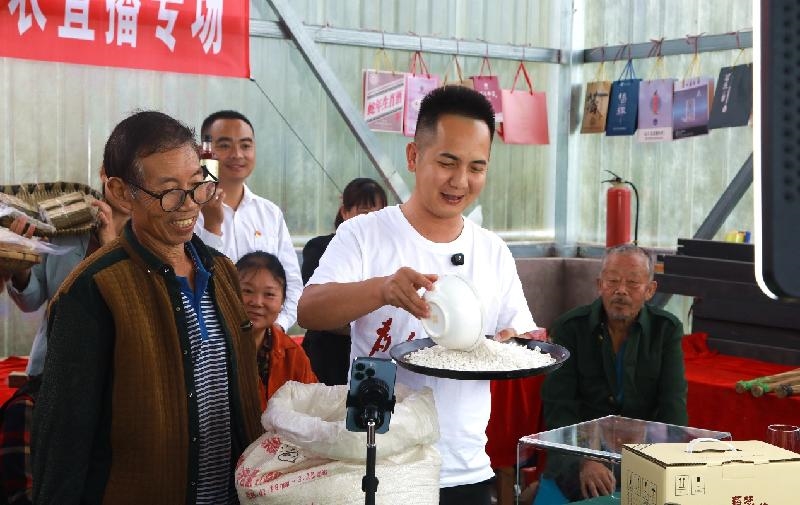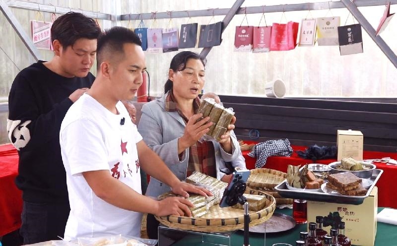 直播中,明二哥与高陵村党委书记范运伟配合默契,不仅详细介绍了各种产品的制作工艺、食用方法,还分享了产品背后的乡村故事和文化内涵。从竹工艺品的编织技艺,到黄粑的传统制作方法,再到红薯粉的纯天然特点,每一个细节都生动展现,使网友们不仅买到产品,更了解到产品背后的文化。直播现场,竹工艺品、干胡豆、干豇豆、黄粑、红薯粉等土特产品琳琅满目。明二哥一边试吃,一边详细介绍产品的特色和制作工艺,引得网友纷纷下单,短短1小时,许多特产、本土农产品销售一空。
