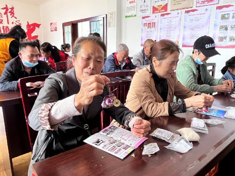 在制作香囊前,志愿者首先向大家介绍了端午的风俗及端午节佩戴荷包的来历,让居民们了解端午的风俗文化。大家各自挑选荷包布料、香料、挂件等材料并动手制作,大家互帮互助,现场一片其乐融融。