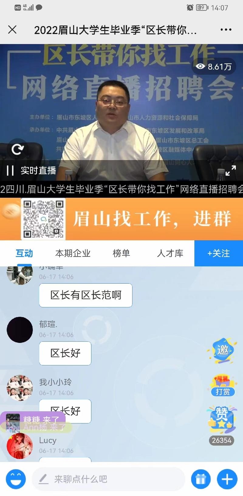 “现在眉山大学生平均工资多少?”“对来眉创业就业大学生有什么优惠政策?”面对东坡区给出的真金白银的待遇、无限广阔的平台、诚意满满的邀约,直播间内刷屏不断,大家纷纷结合自身实际询问东坡区当前就业环境、优惠政策等,短短一个多小时的直播,累计吸引了17余万人次在线观看。