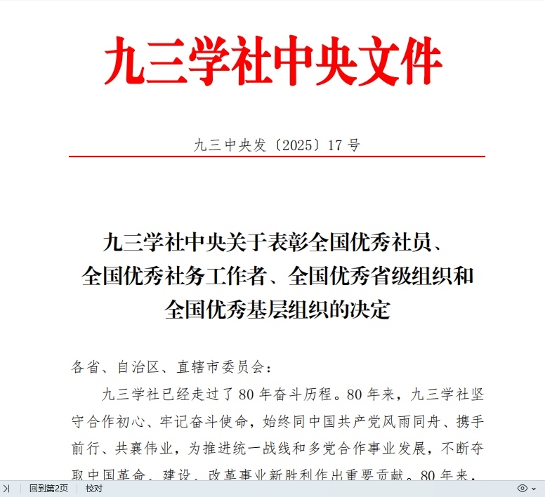 近日,九三学社中央印发《关于表彰全国优秀社员、全国优秀社务工作者、全国优秀省级组织和全国优秀基层组织的决定》,九三学社东坡区基层委员会荣获“全国优秀基层组织”称号。这是九三学社东坡区基层委员会继2022年主委孙倩获评“全国宣传思想工作先进个人”后,获得的又一全国性荣誉。
