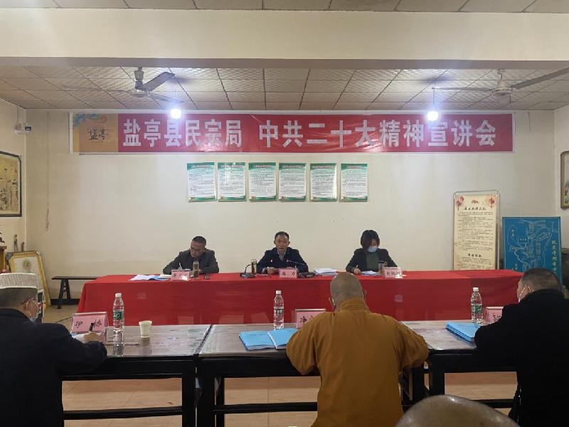 潘力强调,全县统战、民宗干部及宗教界要以党的二十大精神凝心铸魂、同心奋进,对谱写建设盐亭篇章作出努力;要始终坚持中国共产党的领导,坚定不移走中国特色社会主义道路,宗教界积极发扬利国利民、爱国爱教、团结进步、服务社会的优良传统,为推动盐亭县各项事业发展贡献了积极力量。要“坚持我国宗教中国化方向,积极引导宗教与社会主义社会相适应”,着力推进新时代宗教中国化行稳致远;要提升宗教修为,加强宗教团体自身建设;要着力培养专业素质过硬的党政干部队伍。