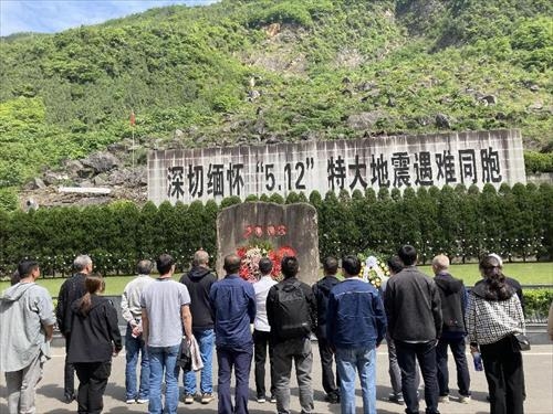 在地震遗址,社员们认真聆听了讲解员的详细介绍,怀着沉痛的心情在北川中学遗址上屹立不倒的五星红旗前向遇难同胞举行了哀悼仪式;在地震纪念馆,社员们被社会各界团结拼搏、众志成城的抗震救灾精神深深打动。