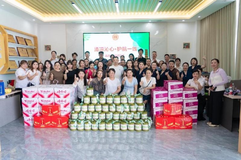 涪城区南山商会为执法中队、环卫绿化工人等户外工作者送上150件矿泉水、100件王老吉、50盒藿香正气液,以及毛巾、洗衣液、沐浴露等共计150份防暑生活用品。
