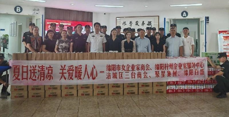 涪城区三台商会为绵阳市公安局特巡警支队送去100 件农夫山泉矿泉水、100 箱东方树叶青柑普洱、100 条吸汗毛巾、100 份藿香正气液等防暑物资。