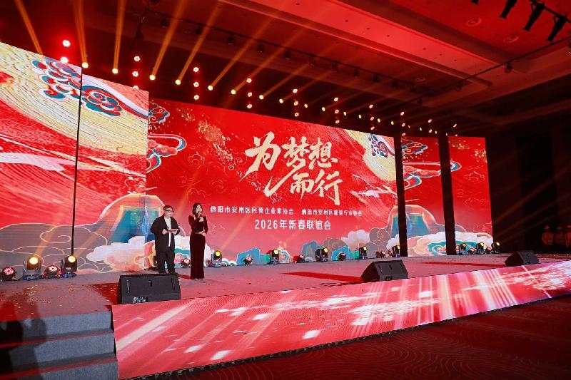 1月26日,“为梦想而行”绵阳市安州区民营企业家2026新春联谊会举行,来自各行业的民营企业家代表欢聚一堂,共迎新春、共话未来。市工商联主席、总商会会长赵倩颖登台击鼓,宣布新春联谊会开幕,区委书记童华建出席活动并致辞。