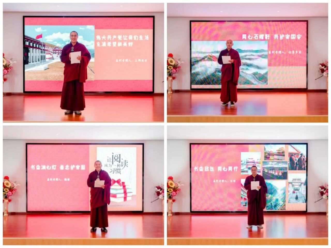 活动回望了红军长征在马尔康的光辉历程,重温艰苦卓绝、鱼水情深的峥嵘岁月,深刻感悟革命先辈坚定信念、为民奉献、团结奋进的崇高精神,进一步凝聚起爱党爱国、团结奋斗的思想共识。7名僧人代表以标准普通话登台,朗诵《伟大共产党让我们生活充满希望和美好》《书香润心灯·善念护家园》《同心石榴籽·共护家国安》《书香致远·同心同行》等原创心得文章,部分僧人辅以藏文诗篇诵读,以藏汉双语深情抒发对党的感恩之情、对祖国的热爱之心、对长征精神的崇敬之意。