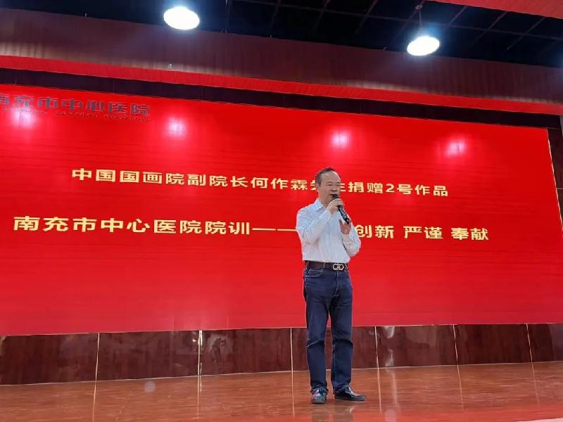 活动首先由市中心医院党委副书记王安果作了热情洋溢的致辞。随后,举行了作品捐赠仪式。由民盟盟员何作霖先生(国家一级书画家,中国国画院副院长,四川省工艺美术大师,川北手工剪纸非遗传承人,享受政府津贴艺术家,南充市雨林书·画院院长)捐赠艺术作品《张澜画像》双面艺术屏风及《南充市中心医院院训——团结、创新、严谨、奉献》,由中心医院党委副书记、院长彭海涛颁发捐赠证书,并代表医院接受捐赠。