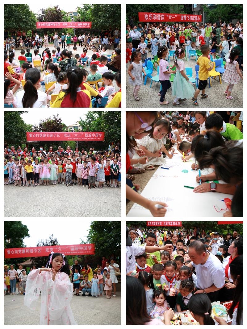 活动当天下午,活动组在亿林龙城小区开展了“同心向党建和谐小区 欢庆‘六一’描绘中国梦”活动,首先,县委统战部常务副部长阳映红进行了致辞。随后,全场大朋友、小朋友集体唱了《共产主义接班人》,培养孩子们树立“爱党、敬党、拥护党”的意识。紧接着,举行了适龄小朋友“抢凳子”活动,既培养了孩子的反应能力还激发了孩子们参加活动的兴趣。接着,工作人员在空地上铺开了2张近十米的宣纸,并挨个为小朋友发放彩笔,让他们在宣纸上绘画出他们脑海中的愿景,充分展示小朋友们的想象。接着,双胞胎兄弟祝乾坤、祝经纬为大家唱了一首《龙的传人》、身穿汉服的何楷昕小朋友为大家带来了舞蹈《声声慢》,现场好评如潮,掌声不断。最后,志愿者们为现场小朋友发放了活动奖品和小蛋糕。