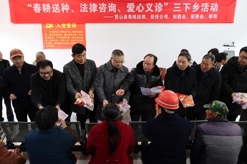 3月2日,营山县委统战部组织县经投公司、县知联会、县新联会、县侨联以及部分网络统战代表人士到清水乡福源社区联合开展“春耕送种、法律咨询、爱心义诊”三下乡活动,送去优质玉米种1000余斤,法律咨询服务180余人次,爱心义诊服务100余人次。