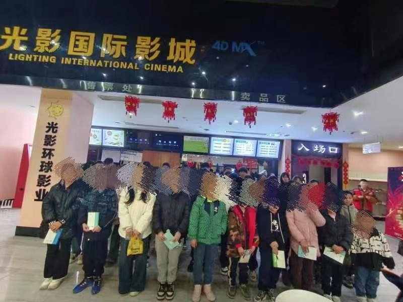 活动尾声,全体人员共同观看电影《哪吒2之魔童闹海》,“我命由我不由天” 的台词引发强烈共鸣,孩子们在观影中感受勇气与拼搏的力量,深受鼓舞。观影结束后,志愿者与学生合影留念,定格美好瞬间。