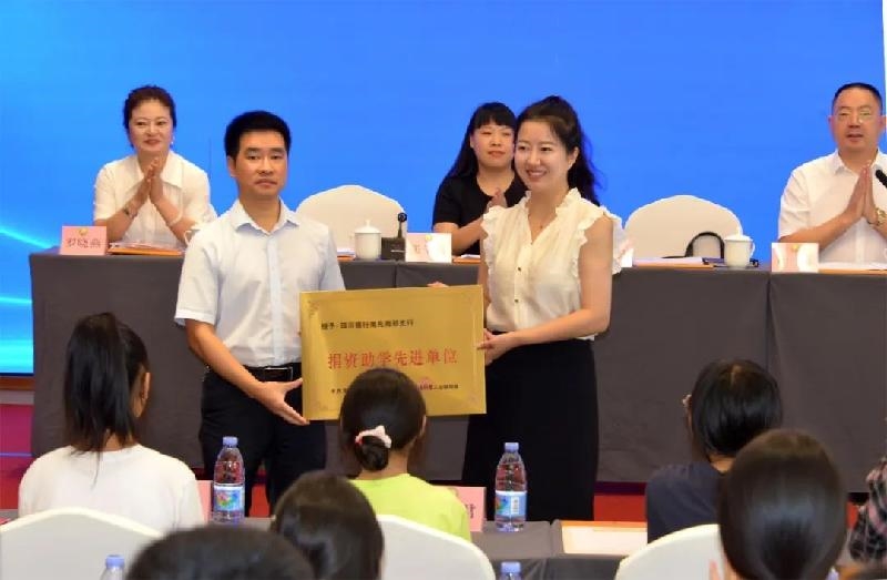 四川银行南充南部支行副行长郑钺也、四川语林花园酒店有限责任公司总经理李英华作为捐资助学先进单位代表上台发言,分享了他们参与公益助学的初心和体会。