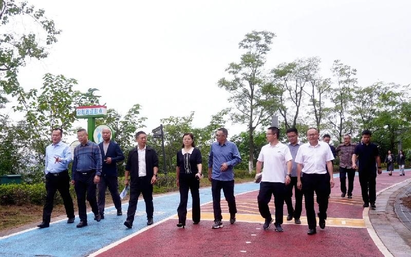 工作组成员首先前往猪山文创项目,沿黄金江岸彩虹步道实地查看沿江生态走廊建设成效及排污口整治情况,并现场听取了黄金江岸建设规划、工程进度及排污口排查整治的具体举措等情况汇报。