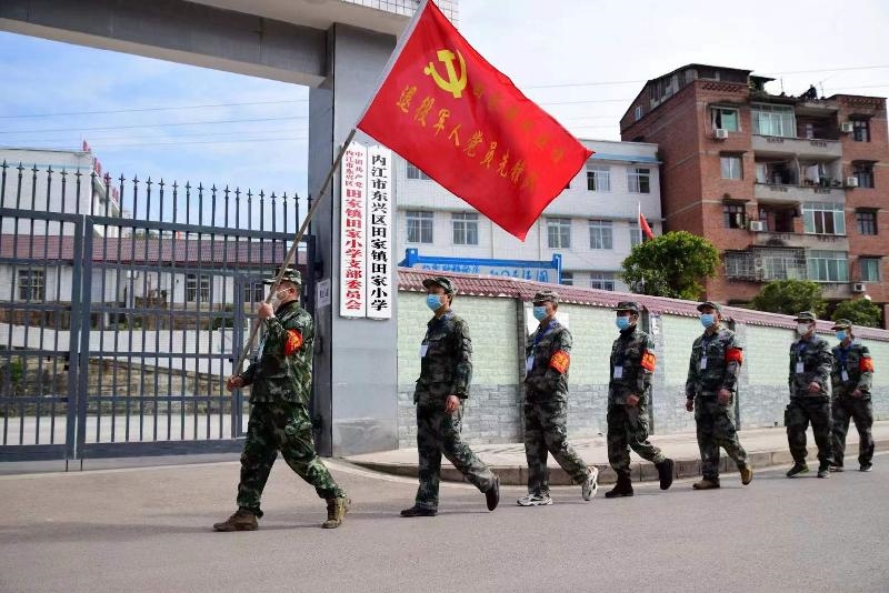 9月10日清晨,在田家镇政府院坝内,濮加隆带领原“田家镇战疫情退伍党员先锋队”7名退役军人手持老兵志愿服务队的队旗,整装列队,快速有力有序投入到疫情防控狙击战。