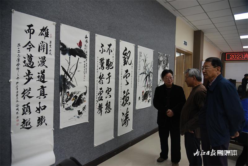 ▲11月23日,2023海峡两岸大千书画艺术交流笔会在张大千美术馆举行,图为悬挂晾晒书画作品。