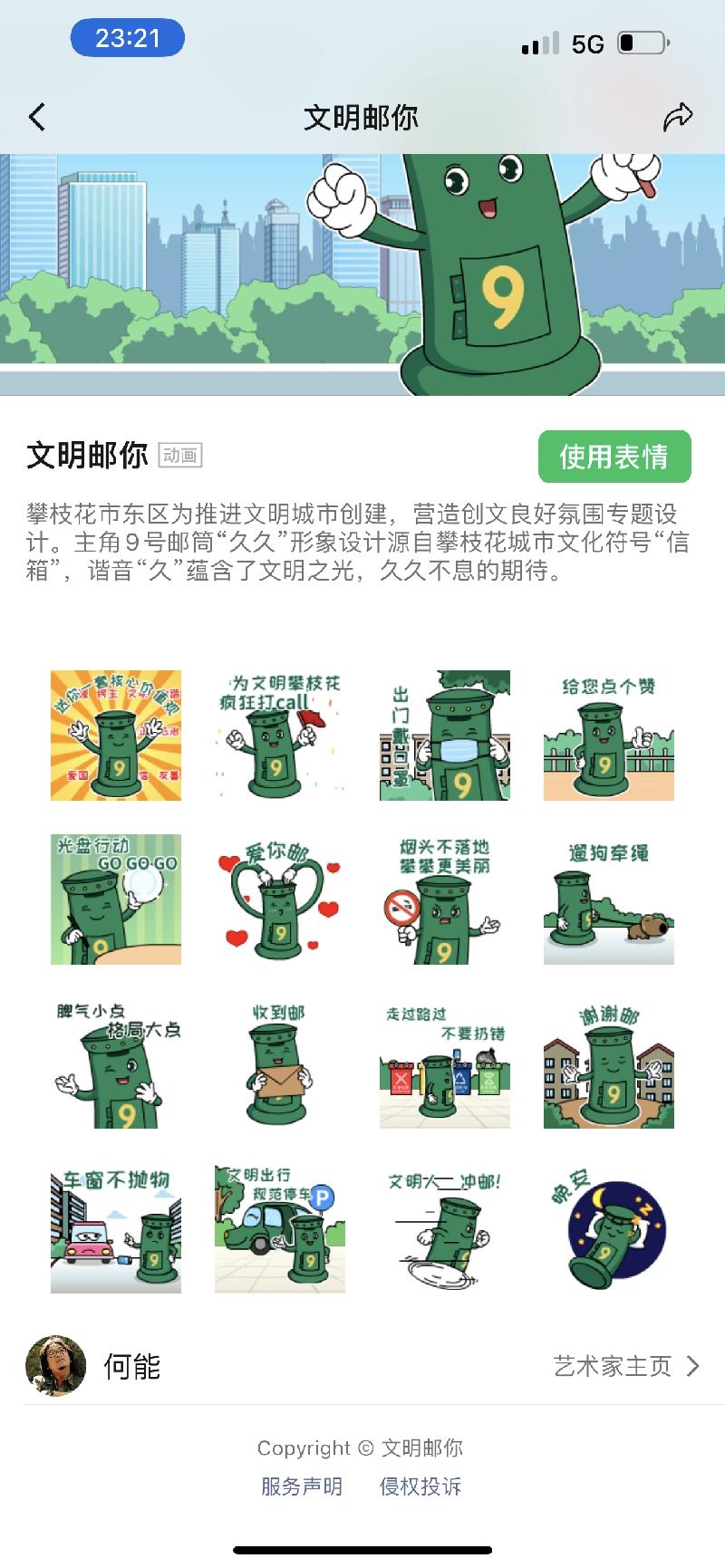 为贯彻落实习近平总书记来川视察重要指示精神,弘扬优秀传统历史文化精神,营造创文“人人知晓、人人参与、人人支持”良好氛围,助力攀枝花市创建全国文明城市,受攀枝花市东区区委宣传部委托,2022年4月起,何能专题设计创作了文明“邮”你,共同前行系列主题表情包。经过反复修改、绘制,主题表情包于2022年7月11日在微信平台正式上线,迅速蹿红网络,获得大量下载使用,可爱又文明的9号邮筒“久久”成为广大网友聊天冲浪新宠。学习强国、时尚东区、gogo攀枝花等媒体平台争相报道。