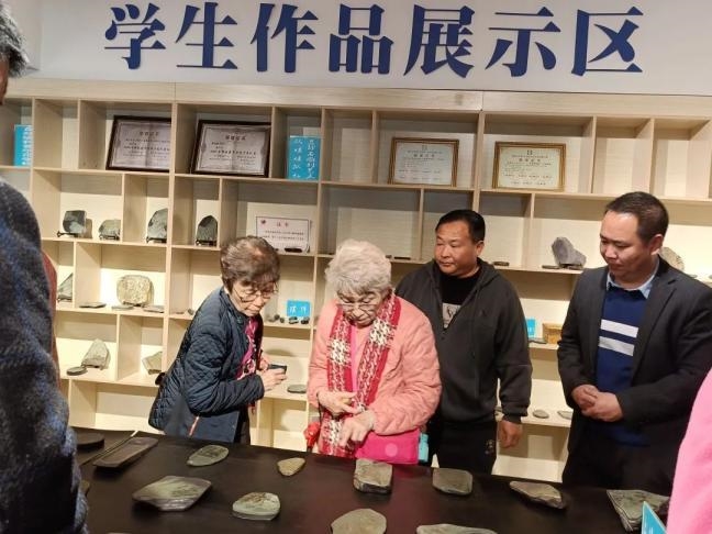 钟女士一行首先抵达大龙潭乡中心学校,参观了学校特色文化建设基地——苴却砚工作坊及苴却砚原材料初加工场地、学生作品展示区、精品苴却砚展室。通过学校负责人详细介绍和相关宣传片展播,了解到苴却砚的由来及原石开采现状。钟女士对学校将苴却砚文化融入校园文化建设的做法给予了高度评价,同时也对学校未来的发展寄予了厚望。