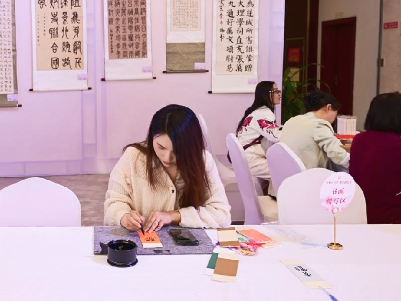“万事胜意”“未来可期”……书画赠写区前排起了长长的队伍,由县书法家协会、县美术家协会会员们现场绘制的书签、扇子等精美实用的文创作品倍受欢迎。大家既能领略书画艺术的独特魅力,又能将这些充满文化底蕴的礼品带回家,让节日的快乐和文化的韵味得以延续。