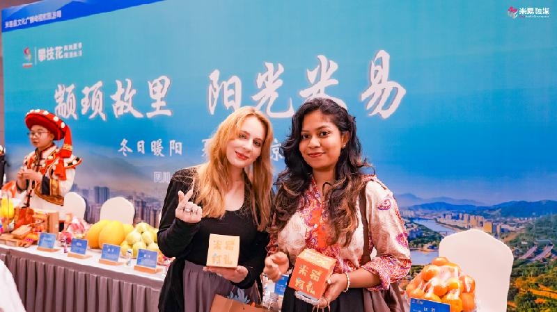 国际友人也对米易表现出浓厚兴趣。来自白俄罗斯的重庆大学留学生妮娅兴奋地展示刚收到的盲盒礼物:“今天在米易展区看到了热情的傈僳族姑娘和小伙,还收到了米易特色的红糖和枇杷膏,很开心,以后有机会我一定要和家人一起去米易游玩。”世界文旅商会署理总会长杨媄媖更是盛赞米易:“作为来自马来西亚的文旅从业者,2023年首次到访米易时,就被这里丰富的物产资源深深吸引。米易的水果品质完全可以与马来西亚的媲美。此次在重庆与米易重逢,感觉特别亲切。我们计划将米易纳入国际康养旅游线路,向海外游客推荐这个充满魅力的阳光之城。”
