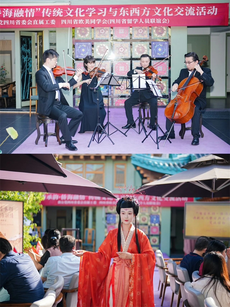 在文化展演环节,四川省欧美同学会文体旅专委会会员表演了弦乐四重奏《花好月圆》,致公党省直工委六总支党员李俊文朗诵《百年初心携手同行》、致公党省直工委四总支党员朗诵《致敬百年奋斗有我》。在东西方文化交流分享环节,多位代表结合自身海外经历与工作实践,分享了跨文化碰撞与融合的见解,现场气氛热烈、灵感迸发。最后,全体与会人员齐声合唱《我和我的祖国》,用深情歌声表达对祖国华诞的诚挚祝福。
