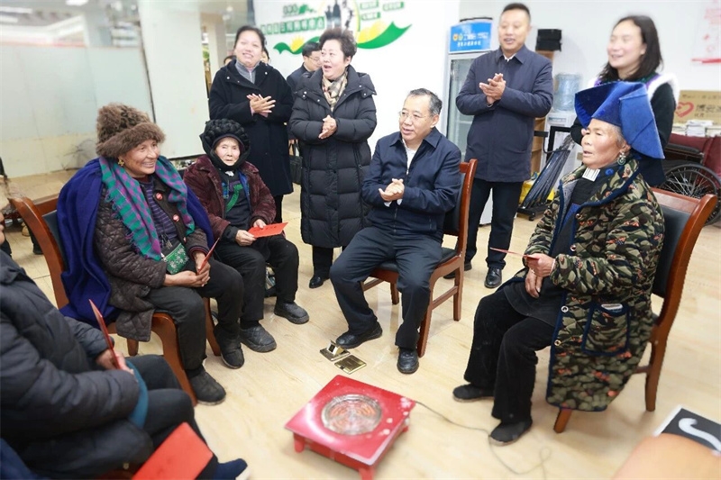 2025年12月26日,普布顿珠在越西县城北感恩社区,调研民族团结进步工作开展情况,与社区老人座谈交流。