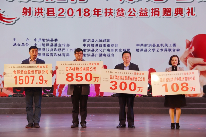 典礼对在全县脱贫攻坚工作中涌现出的舍得酒业有限公司等20个社会扶贫榜样企业和黄巨贤等9名最美扶贫人进行了通报表扬。舍得酒业、天齐锂业、绿然科技、川中建材4家公司代表登台,总计捐赠2765.9万元。县虹桥、欣泽等4家优秀建筑企业代表累计共捐624.5万元。随后,四川来者文化旅游投资有限公司等19家企业代表依次上台,现场举牌展示了捐赠成果。