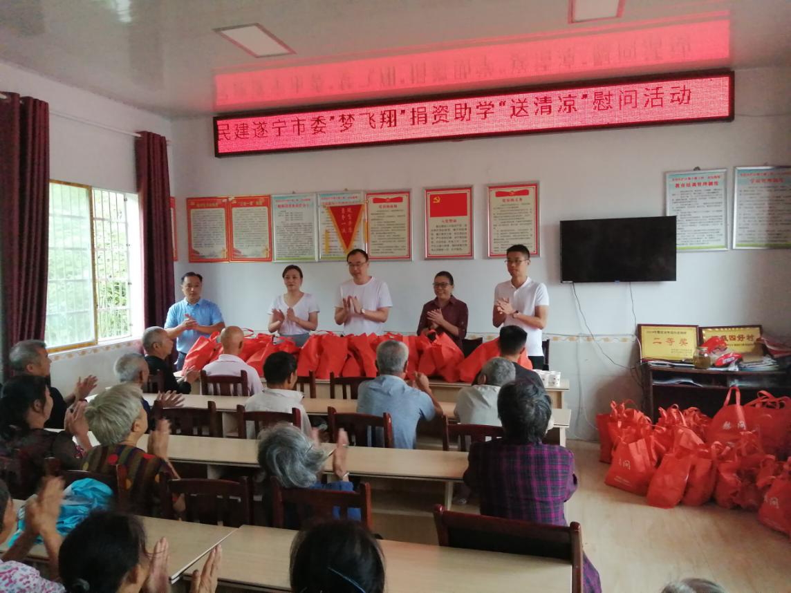 8月12日,民建遂宁市委副主委、河东新区管委会副主任黄鹏,民建安居总支主委、区人大常委会副主任胡均蓉带队赴安居区栏江镇土桥村开展“梦飞翔”捐资助学暨“送清凉”慰问活动。