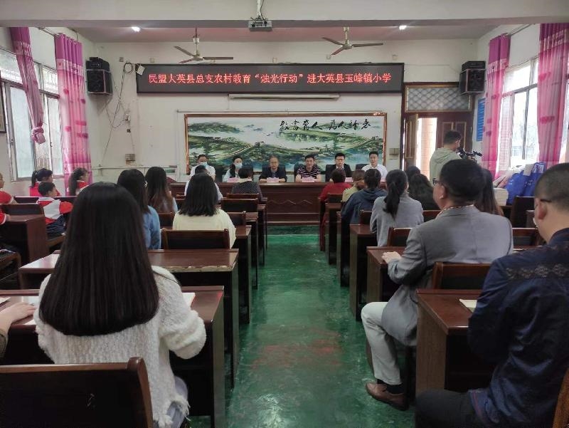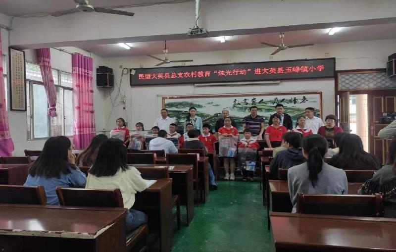 5月17日,民盟大英县总支组织部分盟员骨干教师到玉峰小学开展“农村教育烛光行动”,在帮助该校教师提高教学水平和教学能力的同时,看望慰问10名贫困学生,向他们赠送了价值2000余元的书包、文具等学习用品。县委统战部相关负责人应邀现场指导。