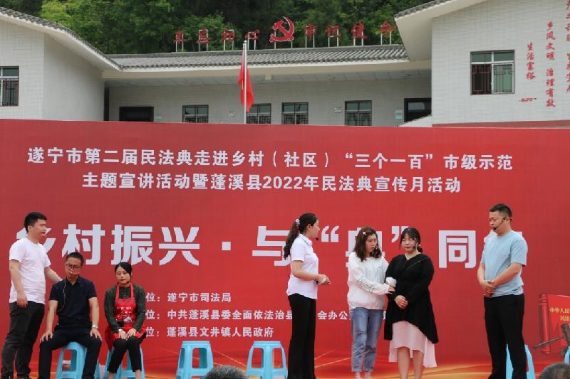 近日,遂宁市司法局、蓬溪县委统战部、县司法局、文井镇人民政府在盟遂合作乡村振兴实践基地——文井镇白鹤林村开展《民法典》走进乡村“三个一百”法治宣讲和法治文艺节目汇演活动。群众方队、人民调解员方队、法律明白人方队、“蓝精灵”普法先锋团四个方队参加活动。