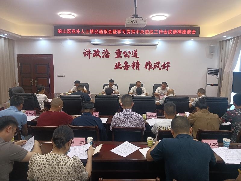 会议通报了中央统战工作会议精神、习近平总书记来川视察重要指示精神、省第十二次党代会精神。各民主党派船山总支主委,区工商联主席,区佛协、区道协、区新联会、区知联会等统战团体负责人,侨属、台属、少数民族等代表人士对贯彻落实中央统战工作会议精神作了交流发言。