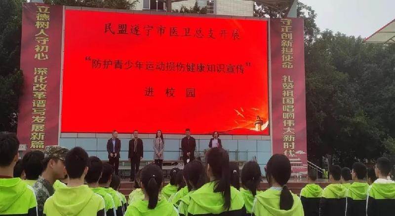 11月10日,民盟遂宁市医卫总支组织遂宁市中医院医疗专家到遂宁涪江中学开展“防护青少年运动损伤健康知识宣传”进校园活动。民盟遂宁市医卫总支主委罗朝霞、副主委陈宏、吕长兴参加活动,本次健康知识讲座由遂宁涪江中学副校长林晓凤主持。遂宁涪江中学高一年级770余名同学聆听了讲座。