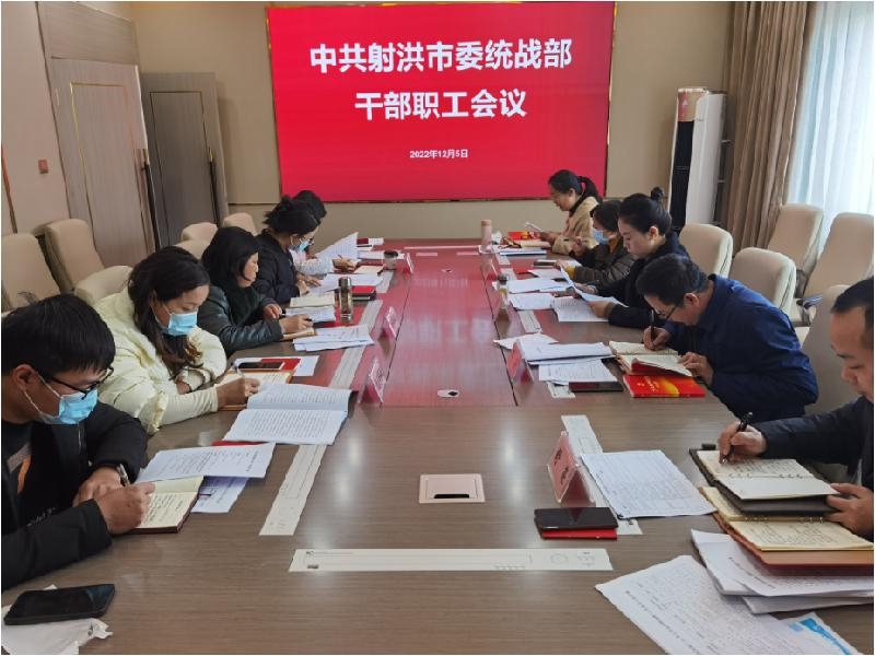 12月5日,射洪市委统战部召开干部职工会,传达学习省委十二届二次全会精神,并对下步工作进行安排部署。射洪市委常委、统战部部长刘颖主持会议并讲话。