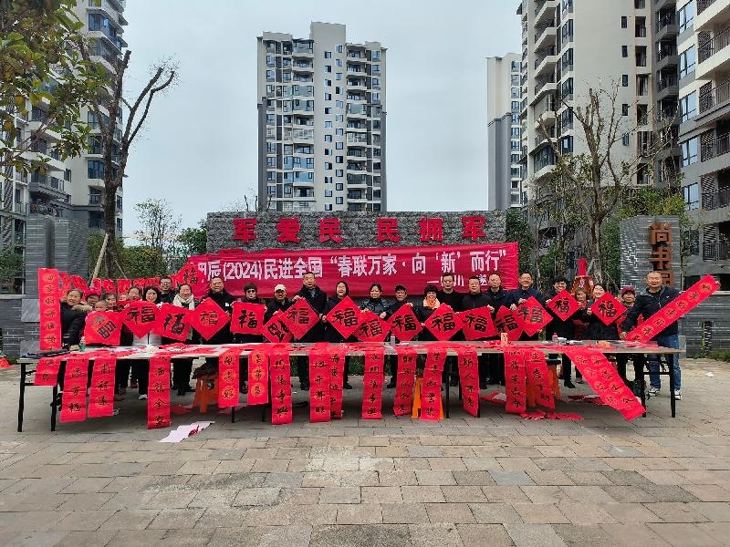 福赠春联祈平安,名家挥毫迎新春。为深入学习贯彻党的二十大精神和习近平文化思想,进一步发挥民主党派文化界别优势,弘扬中华优秀传统文化,营造喜庆祥和的新春文化氛围,民进遂宁市委会于1月17日在安居区柔刚街道尚书苑小区开展甲辰(2024)民进全国“春联万家·向‘新’而行”活动。民进四川省委会副主委、遂宁市委会主委、副市长吴新春出席活动。