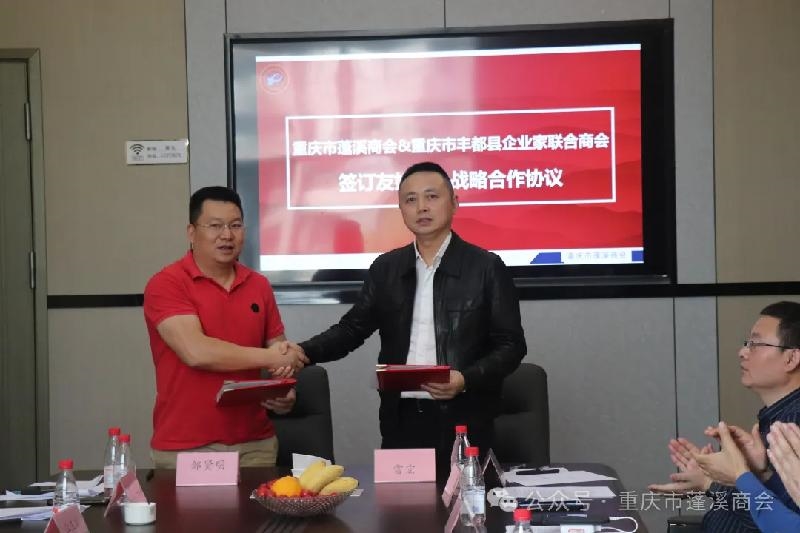 大家一起观看了重庆市丰都县企业家联合商会的宣传视频和重庆市蓬溪商会2023年活动影集、商会会歌MV。重庆市蓬溪商会执行会长雷宏代表商会对丰都县企业家联合商会的到来表示诚挚的欢迎,详细介绍了商会的相关情况。重庆市丰都县企业家联合商会会长邹贤明详细介绍了商会的班子成员情况、商会发展建设成果等。双方商会班子成员就个人和企业情况一一作介绍,分享交流企业发展资源和合作意愿。双方签订了《重庆市丰都县企业家联合商会和重庆市蓬溪商会缔结友好商会的合作协议》。