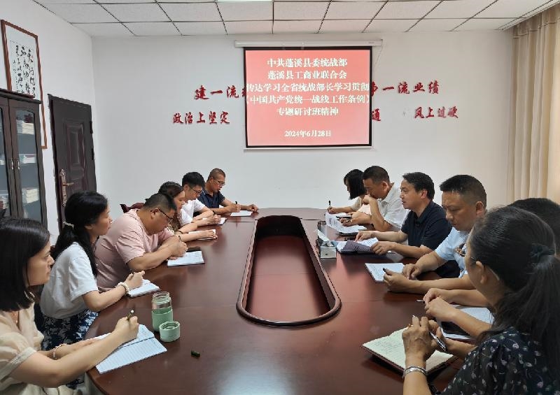 6月28日,遂宁市蓬溪县委统战部(县工商联)召开部务会、机关干部职工会议传达学习全省统战部长学习贯彻《中国共产党统一战线工作条例》专题研讨班精神,从“四个下功夫”抓好贯彻落实。