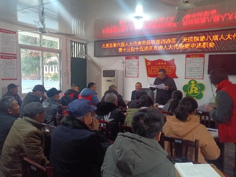 12月9日,天保镇在沙石咀村举行直选人大代表集中述职会,县人大代表、县委常委、县委统战部部长、县总工会主席田彬,镇人大代表、天保镇便民服务中心主任漆秀琼,镇人大代表赵兰英,镇人大代表漆家伦现场述职,分别围绕自身履职情况向选民进行全面而深入的汇报。