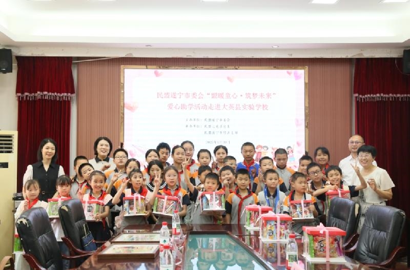 为发挥民盟界别优势,助力义务教育发展。5月30日,民盟遂宁市委会联合民盟大英县总支、民盟遂宁市经济支部在大英县实验学校开展“盟暖童心·筑梦未来”爱心助学活动。民盟遂宁市委会副主委、秘书长蒋红梅出席活动并讲话,民盟大英县总支主委、大英县人大常委会副主任刘华,大英县实验学校党总支书记熊高军, 30余名学生代表参加了本次活动。活动由民盟大英县总支教育支部主委、大英县实验学校常务副校长李朝晖主持。