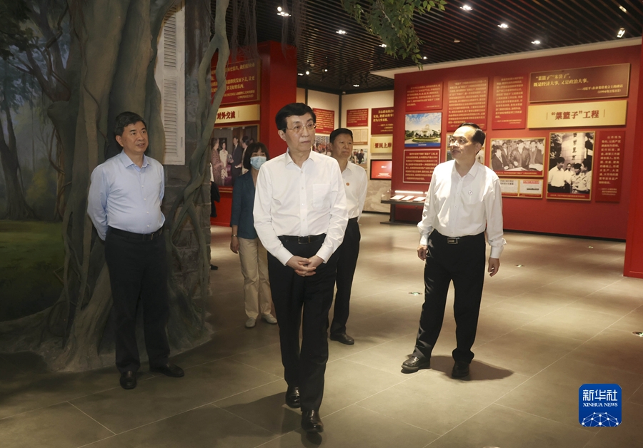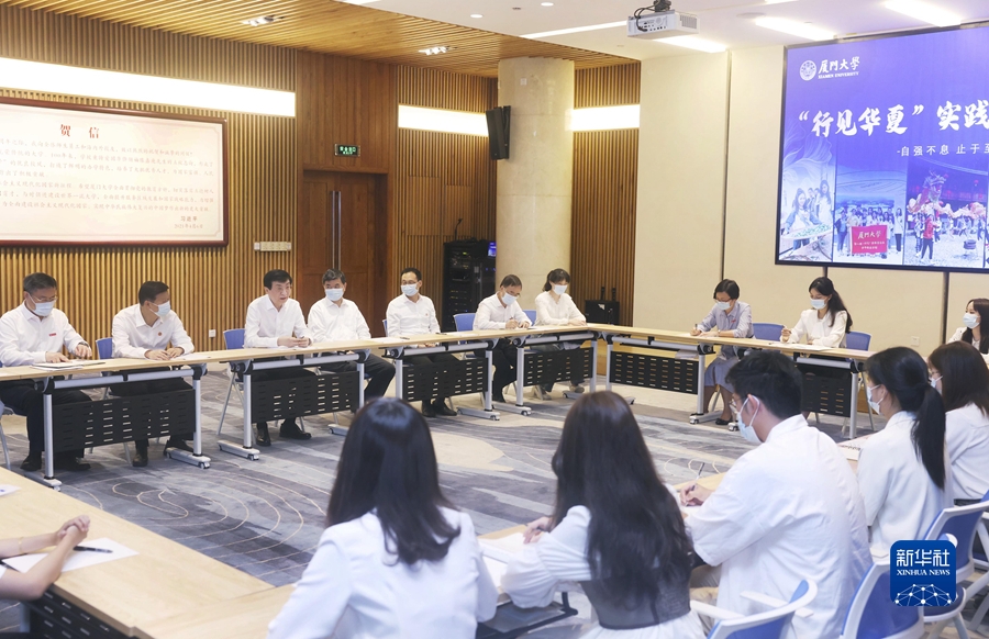 6月17日,第十五届海峡论坛大会在福建厦门举行。中共中央政治局常委、全国政协主席王沪宁出席,宣读习近平总书记贺信并致辞。在闽期间,王沪宁参观福州市“3820”战略工程实施30周年成就展、“共同家园 共同记忆——闽台关系档案文献展”,看望在福州的全国政协委员和福建省政协机关干部、厦门大学在校台湾学生,考察台资企业、福州市三坊七巷历史文化街区、厦门市海沧区洪塘村赤土社、厦门五通客运码头等。这是王沪宁看望厦门大学在校台湾学生。新华社记者 刘卫兵 摄