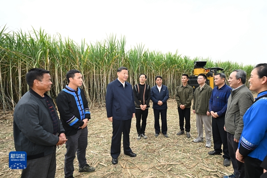 14日下午,习近平到来宾市考察调研。在国家现代农业产业园黄安优质“双高”糖料蔗基地,习近平察看万亩甘蔗林和机械化作业收割场景,听取基地情况介绍。他走进甘蔗林,详细了解甘蔗良种繁育技术要领,同蔗农、农机手和农技人员亲切交流。习近平指出,广西是我国蔗糖主产区,要把这一特色优势产业做强做大,为保障国家糖业安全、促进蔗农增收致富发挥更大作用。要积极培育和推广良种、提高机械化作业水平,建设好现代农业产业园。要探索建立更加稳定的利益联结机制,让广大农民共享农村改革和发展成果。他祝愿乡亲们的生活像甘蔗一样甜蜜。
